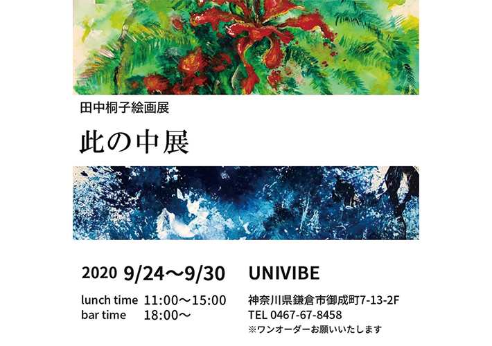 田中桐子 絵画展「此の中展」2020/9/24-9/30Lunch Time 11:00-15:00Bar Time 18:00-※ワンオーダーお願いいたします