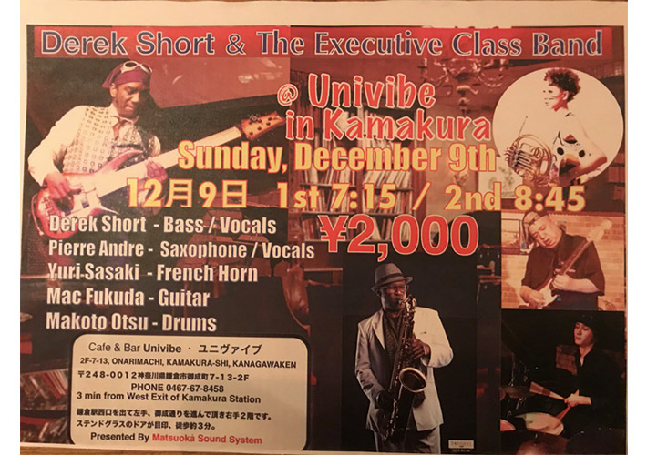 Derek Short & The Executive Class Band2018.12.9 (Sun.)OPEN 18:001st 19:152nd 20:45Music Charge \2,000Derek Short -Bass/VocalsPierre Andre -Saxophone/VocalsYuri Sasaki -French HornMac Fukuda -GuiterMakoto Otsu -DrumsDerek Short[Click Here!]