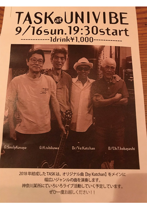 TASK at univibe9/16 (Sun.)Open 18:00Start 19:30Charge 1,000 (1drink)2018年結成したTASKは、オリジナル曲(by Katchan)をメインに幅広いジャンルの曲を演奏します。神奈川県某所にて色々ライブ活動をしていく予定。ぜひ一度お越しください!
