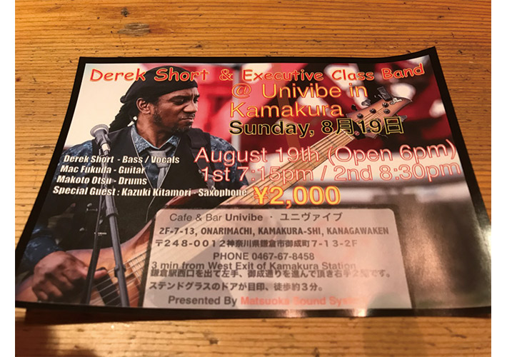 Derek Short & Executive Class BandOpen 18:001st 19:152nd 20:30music charge 2,000yenPresented by Matsuoka Sound SystemDerec Short[Click Here!]