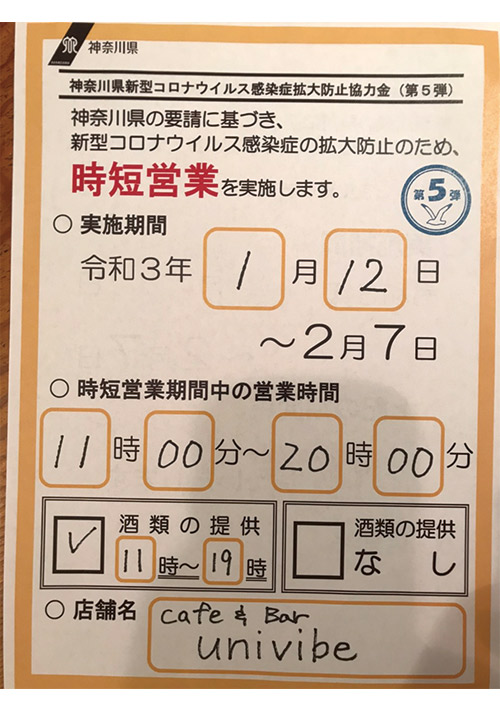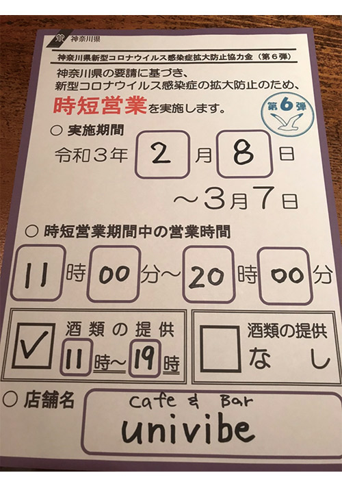 時短営業のお知らせ2/8から3/7まで11:00a.m.から8:00p.m.の営業とさせていただきます。