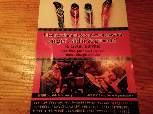 singin' , slidin' & groovin'8/21(日)18:00 Open19:30 StartCharge : 1,500 yenシンガー、スライド&ラップスティールプレイヤー吉村瞳とドラマー&パーカッショニスト小笠原友子とのユニット。アメリカ南部サウンド(スワンプやブルース)に根ざした音楽、ネイティブ・アメリカンの音楽に影響を受けたロックンロール、オリジナルを演奏。ソウルフルな歌声と渇いたスライドサウンドにアーシーなビートが重なる。