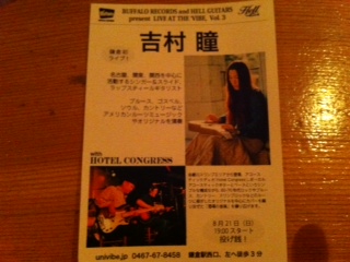スライド、ラップスティールギター&シンガーの吉村瞳さん。ブルース、ソウル、カントリーなどアメリカンルーツミュージックやオリジナルを演奏。アコースティックデュオHotel Congress。ボーカル、ギター、ベースで60〜70sのロック、ブルース、スワンプロックなどのルーツに根ざしたオリジナルを中心にカバーを織り交ぜた酒場の音楽を繰り広げます。乞うご期待!!! 今回は投げ銭でやります。日時 8月21日(日)7:00 startcharge:投げ銭