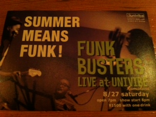 お待たせしました!!おなじみ鎌倉発進の3ピースバンド『FUNK BUSTERS』の登場です!グイグイ来る黒いgrooveとカッコいいギタープレイで勝手に体が揺れちゃいます!カバーの選曲も抜群です。損はさせません。日時 8月27日(土)8:00 Startcharge:1500yen 1drink付いてます。