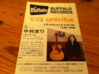 アメリカンルーツミュージックを英詞のオリジナル曲でアコースティックギターにのせて歌う、中村 まり LIVE!!サンプル聞いたけど最高でした!2月27日(日)19:30 StartMusic Charge:1500 yen鎌倉発のBUFFALO RECORDSのスペシャルセールやります!新譜から掘り出し物まで。2月26日(土)27(日)11:00〜18:00